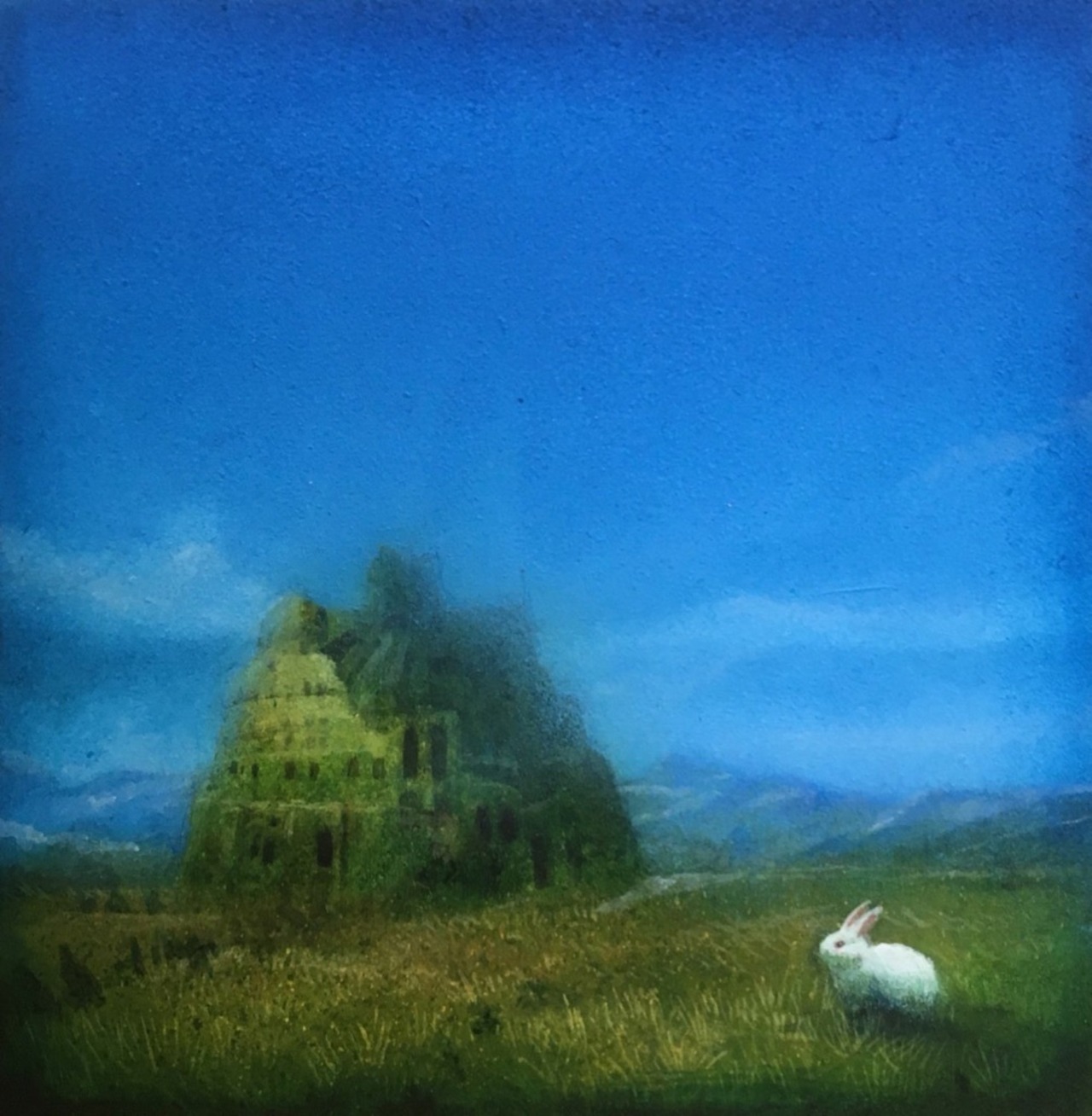 こちらはバベルの塔とウサギをモチーフとして選び描いた作品です。地平線に見えるバベルの塔の廃墟と生物であるウサギを対比して「栄枯盛衰」をテーマにしています。アクリル絵の具を薄く重ねて空気感を表現しています。
